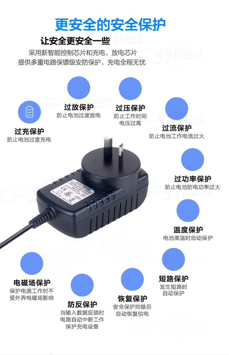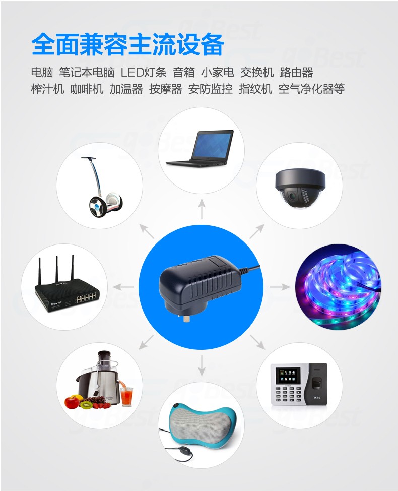 • 采用前沿IC控制方案和先進(jìn)的制造工藝,高精度,低噪音;過壓,過流,過充,短路等多重保護(hù)。