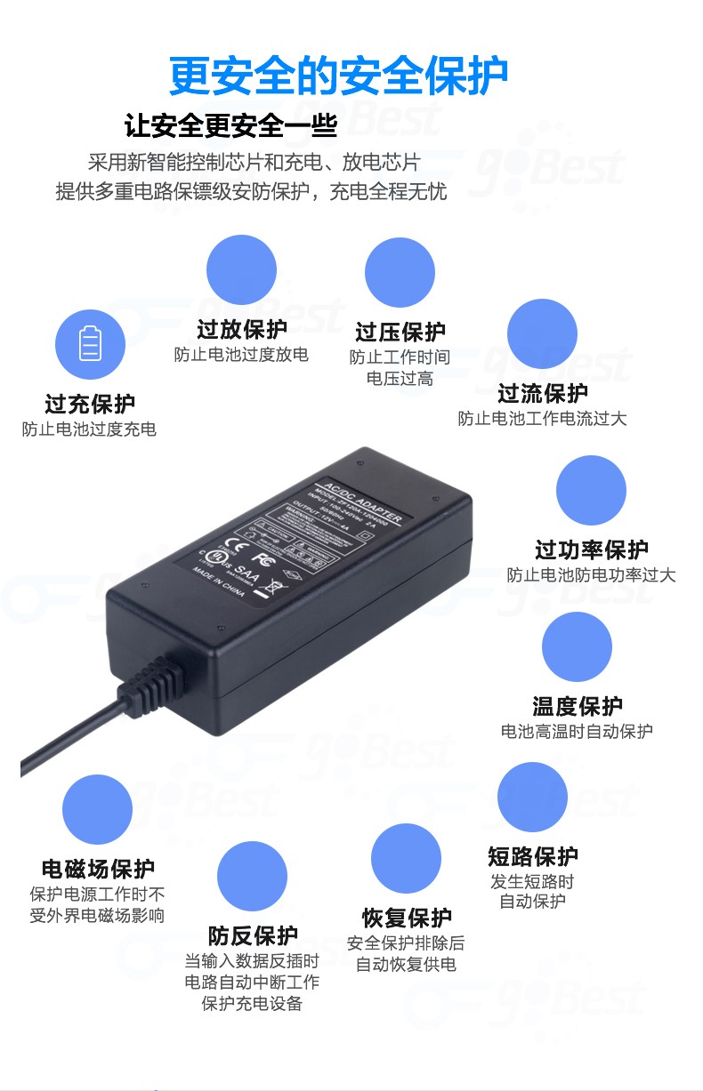 • 采用前沿IC控制方案和先進的制造工藝,高精度,低噪音;過壓,過流,過充,短路等多重保護。